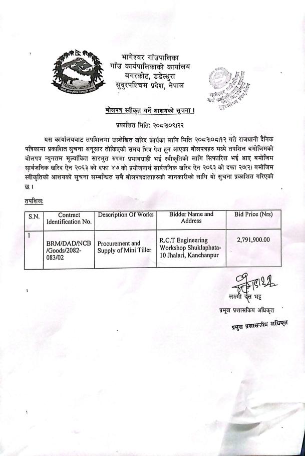 » बोलपत्र स्वीकृत गर्ने आशयको सूचना ।