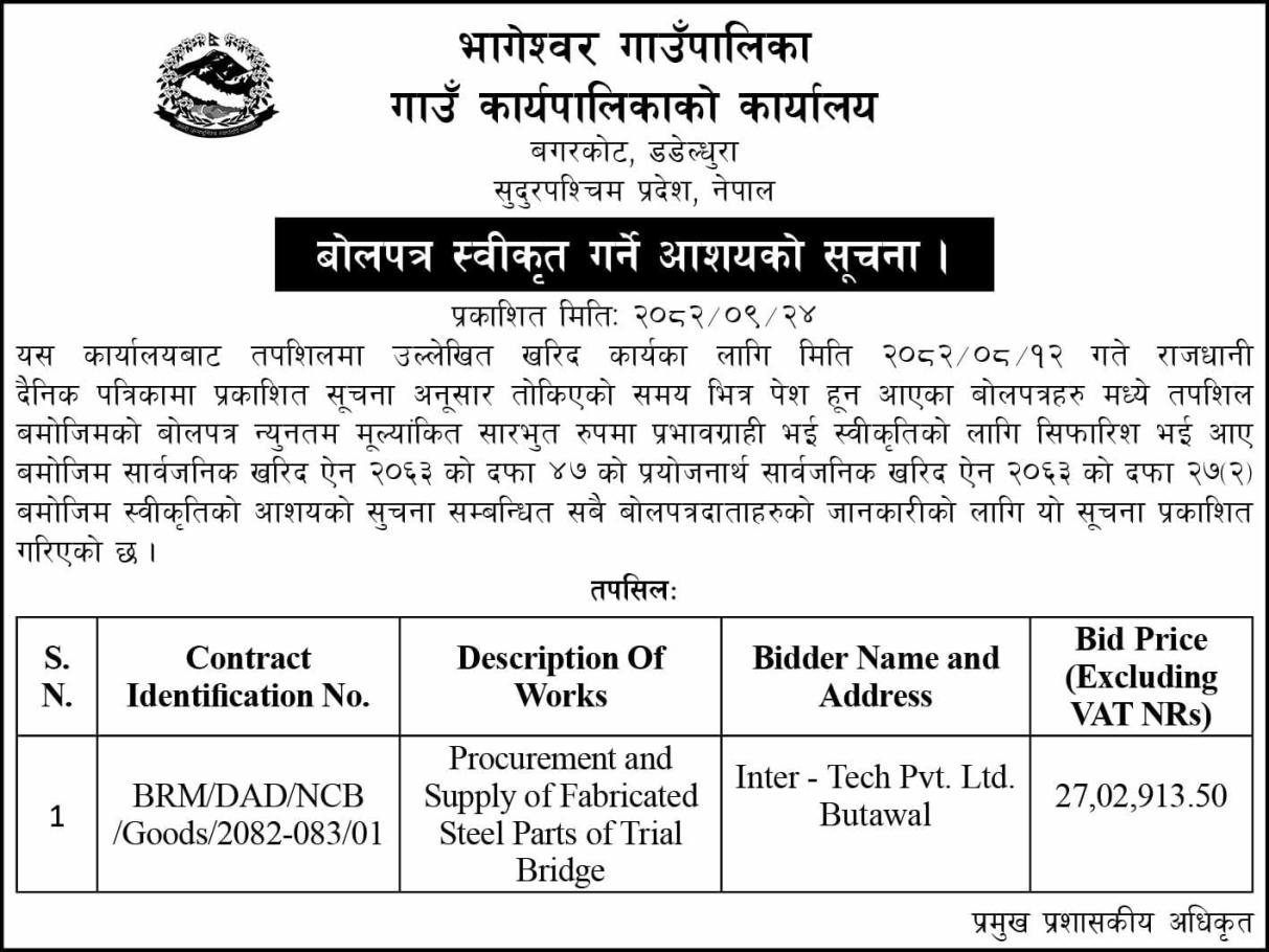 बोलपत्र स्वीकृत गर्ने आयको सूचना