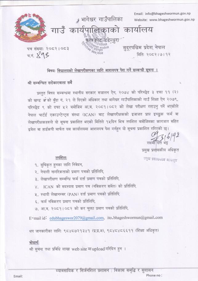» विद्यालयको लेखापरिक्षणका लागि आशयपत्र पेश गर्ने सम्वन्धी सूचना ।