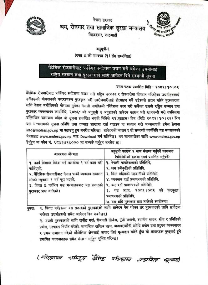 वैदेशिक रोजगारबाट फर्किएर स्वदेशमा उद्यम गरी बसेका उद्यमीलाई राष्ट्रिय सम्मान तथा पुरस्कारको लागि आवेदन दिने सम्बन्धी सूचना