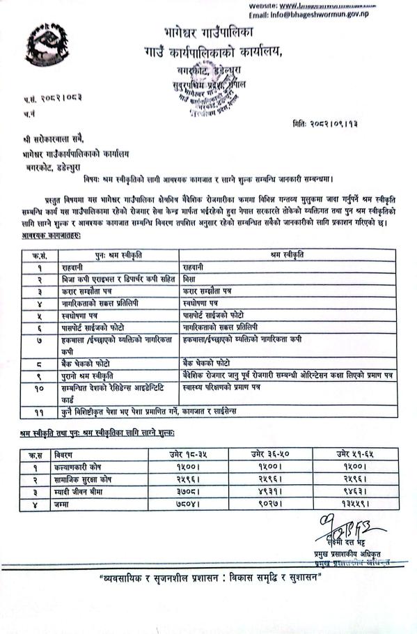 श्रम स्वीकृतीको लागि आवश्यक कागजात र लाग्ने शुल्क सम्बन्धी जानकारी सम्बन्धमा।